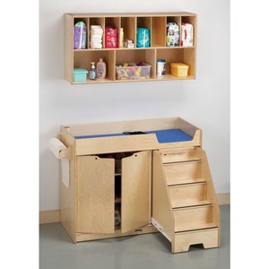 Daycare changing tables, daycare changing organizers, and more! A changing table or changing pad is an elevated platform that allows for easy changing of a baby's diapers. Select from our daycare changing tables, daycare changing organizers, and daycare changing stations. A recessed back for added strength, stability, and beauty. The stairs are the main feature of this particular changing station. The color in the carpet and walls, the particular furniture to be utilized, and even the actual staircase to be installed must be conducive to the home's living room total design. Three generous supply shelves provide handy storage options. The hardwood unit has sturdy stairs that you pull out with your hand or foot and tuck away behind a door. The 7d changing well allows for 1 thick mat and still meets 6d requirement. A recessed back for added strength, stability, and beauty. The stairs feature a locking mechanism for safety. We offer deluxe models which include lockable storage and steps for independent access by older toddlers. Stairs glide easily on runners and lock for security.